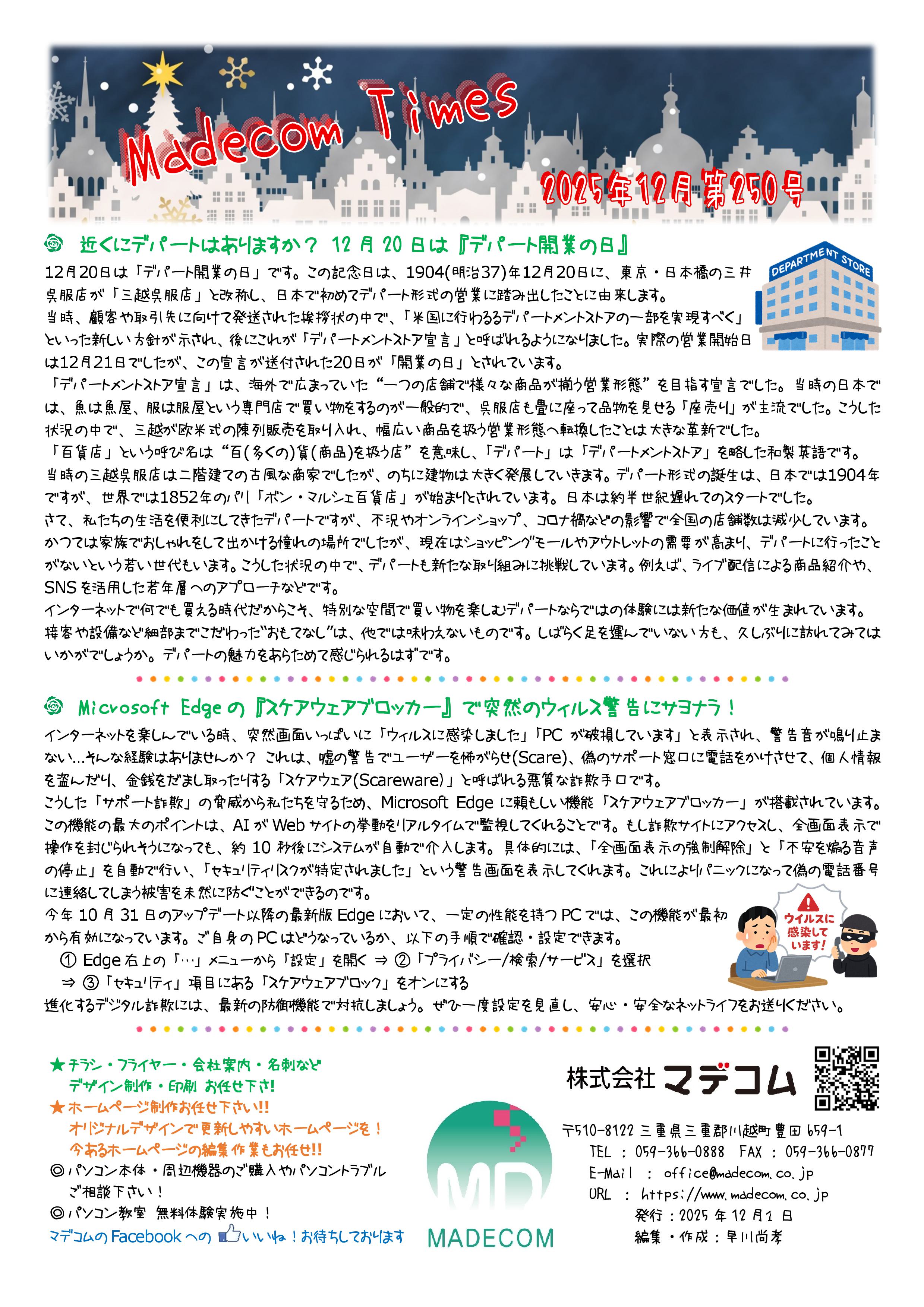 今月のマデコムタイムズは ◆ 近くにデパートはありますか? 12月20日は『デパート開業の日』 ◆ Microsoft Edgeの『スケアウェアブロッカー』で 突然のウィルス警告にサヨナラ!