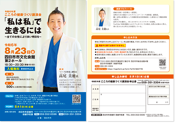 2024年8月23日に四日市市文化会館にて開催される令和6年度こころの健康づくり講演会『「私は私」で生きるには~全ての女性により良い明日を~』のチラシデザインを制作いたしました。