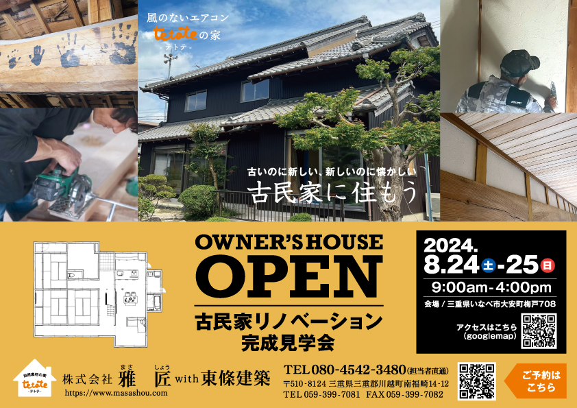 三重県三重郡川越町の建築業 株式会社 雅匠様の古民家リノベーション完成見学会のチラシ制作を承りました。